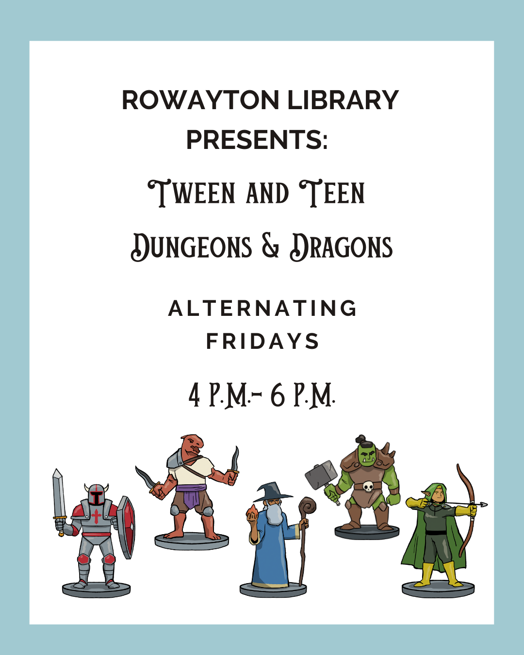 Embark on fantastical adventures from the comfort of the Library! Tweens and Teens Ages 11+ can join a band of heroes in games of Dungeons & Dragons. Books, Character Sheets, and Dice are provided. This campaign is Dragons of Stormwreck Isle. Just bring your wit and imagination!